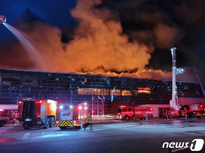 (구미=뉴스1) 최창호 기자 = 4일 오후 5시25분쯤 경북 구미시 4공단에 있는 공장건물에서 불이 났다.신고를 받은 소방당국은 대응1단계에 이어 2단계로 격상하고 펌프차 등 장비 46대와 100명을 투입 진화작업을 벌이고 있다.(경북소방본부제공)2022.10.4/뉴스1