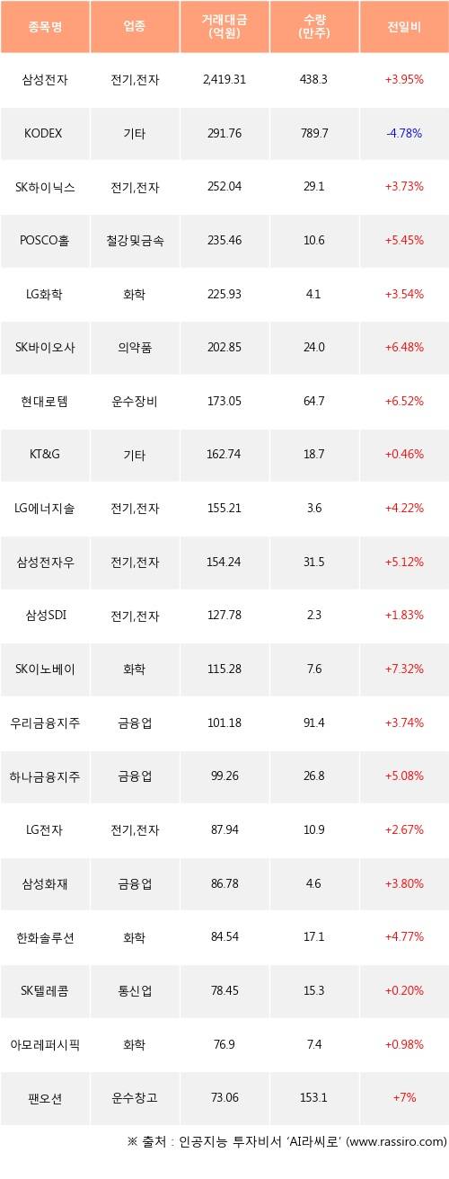 삼성전자, SK하이닉스, POSCO홀딩스 등은 전일 대비 주가가 상승했고, KODEX 200선물인버스2X 등은 주가가 하락했다.