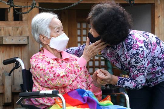 요양병원·시설 등 감염취약시설의 대면 접촉 면회가 가능해진 4일 대전 서구 한아름실버케어센터에서 입소자와 딸이 면회를 하고 있다.