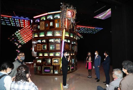 대전시립미술관 열린수장고가 4일 개관한 가운데 지역 예술가들을 비롯한 참석자들이 백남준 작가의 '프랙탈 거북선'을 관람하고 있다.