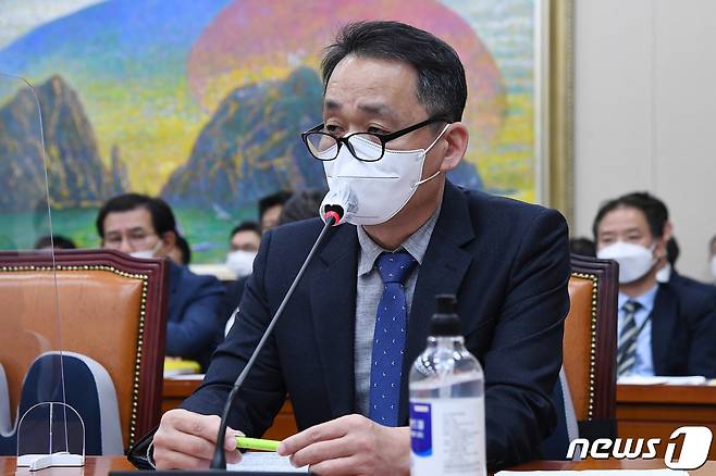 (서울=뉴스1) 유승관 기자 = 박이삼 이스타항공 조종사지부장이 4일 서울 여의도 국회에서 열린 정무위원회의 국무조정실, 국무총리비서실 국정감사에서 윤창현 국민의힘 국회의원의 이스타항공 비리 의혹 질의에 증인으로 출석해 답변하고 있다. (공동취재) 2022.10.4/뉴스1