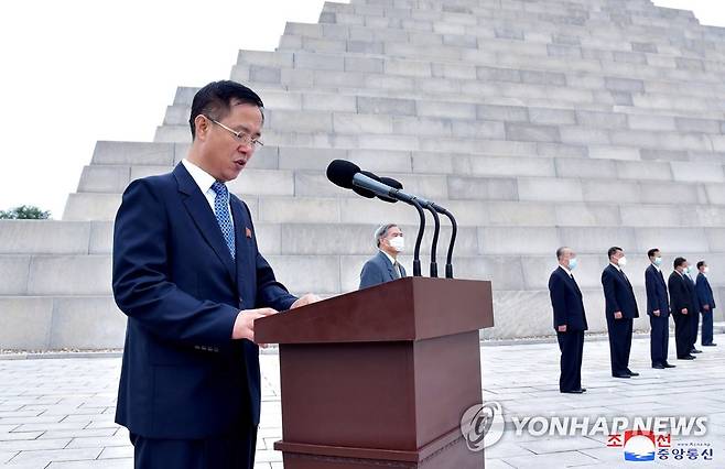 (평양 조선중앙통신=연합뉴스) 북한 개천절 기념행사가 3일 평양 단군릉 앞에서 진행됐다고 조선중앙통신이 4일 보도했다. 행사에는 맹경일 조국통일민주주의전선 중앙위원회 의장 겸 서기국장, 박명철, 김완수 조국통일민주주의전선 중앙위원회 의장들, 평양시 근로자들이 참석했다. 2022.10.4