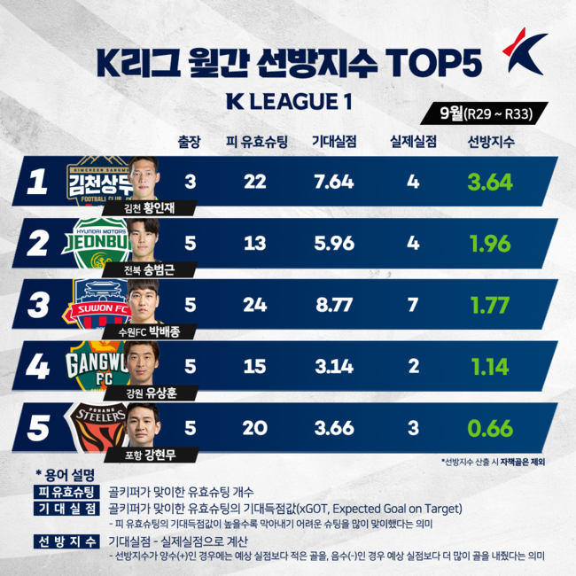 연맹은 올 시즌 5월부터 축구데이터 분석 전문업체 비프로일레븐과 함께 매월 K리그 골키퍼들의 '선방지수'를 월 단위로 공개하고 있다.