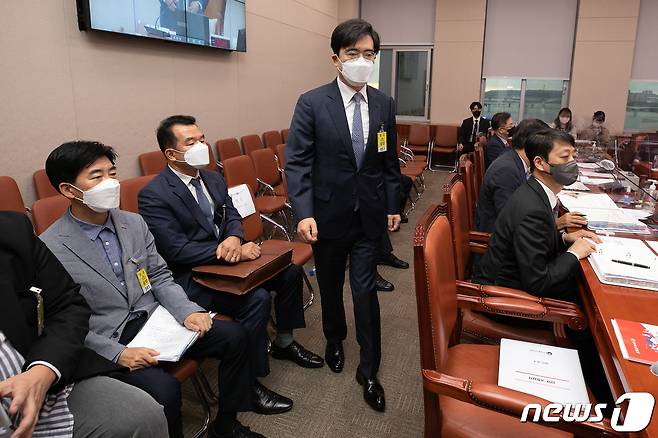 (서울=뉴스1) 유승관 기자 = 공영운 현대자동차 사장이 4일 오후 서울 여의도 국회에서 열린 산업통상자원중소벤처기업위원회 국정감사에서 증인으로 출석해 증인 선서를 위해 발언대로 이동하고 있다. (공동취재) 2022.10.4/뉴스1
