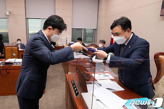 (서울=뉴스1) 유승관 기자 = 공영운 현대자동차 사장(왼쪽)이 4일 오후 서울 여의도 국회에서 열린 산업통상자원중소벤처기업위원회 국정감사에서 증인으로 출석해 증인선서를 마친 뒤 선서문을 윤관석 국회 산자중기위 위원장에게 전달하고 있다. (공동취재) 2022.10.4/뉴스1