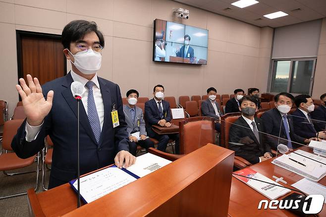 (서울=뉴스1) 유승관 기자 = 공영운 현대자동차 사장이 4일 오후 서울 여의도 국회에서 열린 산업통상자원중소벤처기업위원회 국정감사에 출석해 증인선서를 하고 있다. (공동취재) 2022.10.4/뉴스1