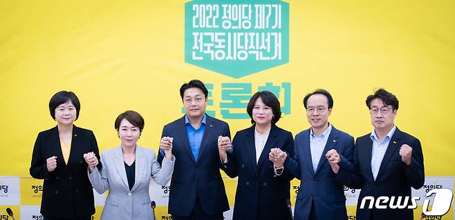 (서울=뉴스1) 유승관 기자 = 정의당 당대표 후보자들이 4일 서울 여의도 국회에서 열린 2022년 정의당 제7기 전국동시당직선거 토론회에 앞서 기념 촬영을 하고 있다. 왼쪽부터 이정미, 정호진 조성주 후보, 김혜련 사회자, 이동영, 김윤기 후보. (정의당 제공) 2022.10.4/뉴스1