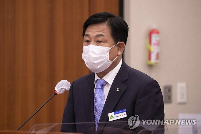 (서울=연합뉴스) 백승렬 기자 = 이무덕 현대중공업 사내협력사 협의회 회장이 4일 오후 서울 여의도 국회에서 열린 산업통상자원중소벤처기업위원회 국정감사에서 참고인으로 출석한 가운데 의원들의 질의에 답을 하고 있다. 2022.10.4 [국회사진기자단]