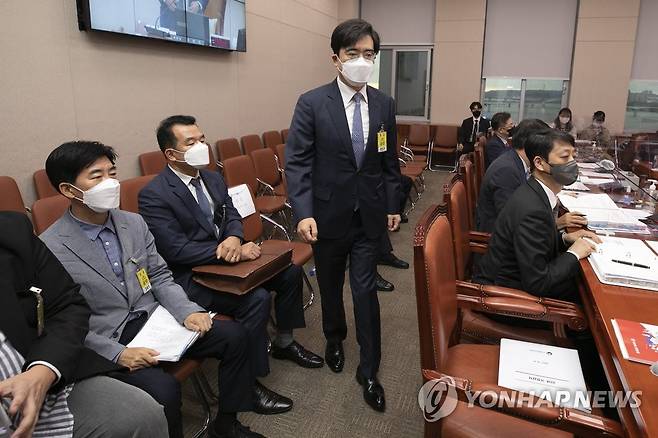 (서울=연합뉴스) 백승렬 기자 = 공영운 현대자동차 사장이 4일 오후 서울 여의도 국회에서 열린 산업통상자원중소벤처기업위원회 국정감사에서 증인 선서를 하기 위해 발언대로 나가고 있다. 2022.10.4 [국회사진기자단]