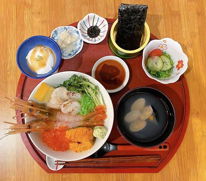 송리단길 ‘도요스6가’. 도화새우에 성게, 연어 등 10가지 해산물을 그림처럼 올린 카이센동을 맛볼 수 있다. 19년 경력 셰프가 세 가지 쌀을 섞어 지은 밥은 사시미와 찰떡. 신선한 해산물을 사시미로 먹고, 초밥으로 먹고, 김에 싸서 먹다 보면 어느새 바닥이 보인다. 보통 한 그릇으로 양이 차지 않는 팜유 라인이라면 ‘포세이돈 카이세동’을 추천. 아, 바삭한 머리 튀김은 서비스다.