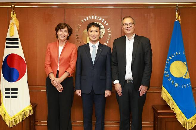 (서울=연합뉴스) 이지헌 기자 = 이복현 금융감독원장은 4일 요아너 도르네바르트 주한네덜란드 대사와 로널드 뷔에스터 네덜란드 연기금 자산운용 회장을 접견하고 탄소중립을 위한 금융산업의 역할을 논의했다고 금감원이 밝혔다. 왼쪽부터 도르네바르트 대사, 이 원장, 뷔에스터 회장. 2022.10.4 [금융감독원 제공. 재판매 및 DB 금지]