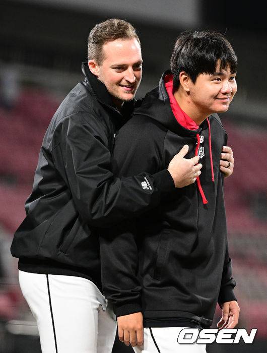 경기를 마치고 승리투수 KT 벤자민이 리드를 지켜내며 홀드를 거둔 김민과 인사를 나누고 있다. 2022.10.04 / dreamer@osen.co.kr