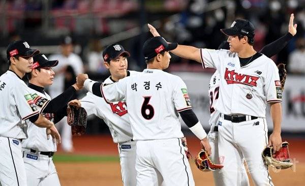 4일 경기도 수원 kt위즈파크에서 ‘2022 신한은행 SOL KBO리그’ kt 위즈와 삼성 라이온즈의 경기가 열렸다. kt가 삼성을 상대로 7-3으로 승리한 후 선수들이 그라운드에서 기쁨을 나누고 있다.