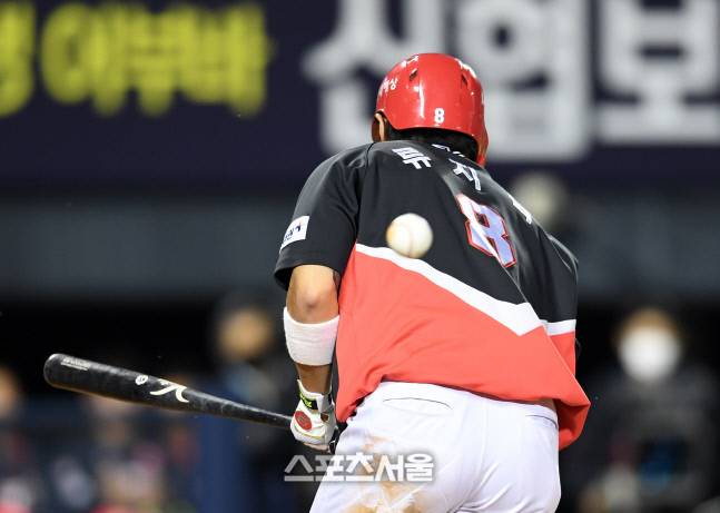 KIA 류지혁이 4일 잠실구장에서 열린 2022 KBO리그 LG와의 경기 9회초 무사 LG 채지선의 투구에 맞고 있다. 2022. 10. 4.