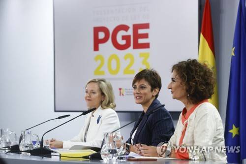 epa10222636 Spain?s government spokeswoman and Territorial Policy Minister Isabel Rodriguez (C), Economy minister Nadia Calvino (L) and Treasury Minister Maria Jesus Montero (R) address a joint press conference following a Cabinet Meeting held at Moncloa Palace in Madrid, Spain, 04 October 2022. EPA/JUAN CARLOS HIDALGO