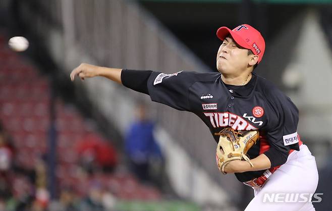 [서울=뉴시스] 권창회 기자 = 4일 오후 서울 송파구 잠실야구장에서 열린 2022 프로야구 KIA타이거즈와 LG 트윈스의 경기, 9회 말 KIA 투수 박준표가 역투하고 있다. 2022.10.04. kch0523@newsis.com