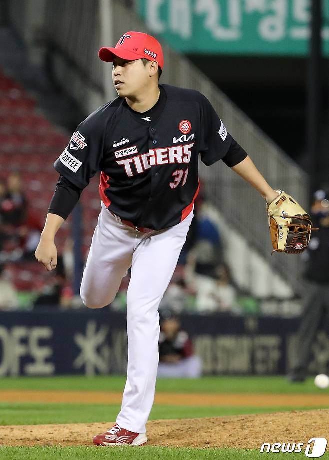(서울=뉴스1) 박세연 기자 = 4일 오후 서울 송파구 잠실야구장에서 열린 프로야구 '2022 신한은행 SOL KBO리그' KIA 타이거즈와 LG 트윈스의 경기에서 9회말 기아 마무리투수 박준표가 역투하고 있다. 2022.10.4/뉴스1