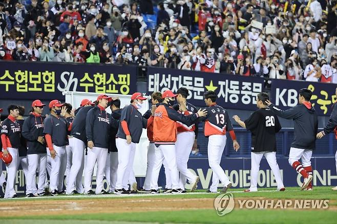 (서울=연합뉴스) 임화영 기자 = 4일 서울 송파구 잠실야구장에서 열린 프로야구 KIA 타이거즈와 LG 트윈스의 경기에서 8-3으로 승리한 KIA 선수들이 김종국 감독 및 코칭스태프와 하이파이브하고 있다. 2022.10.4