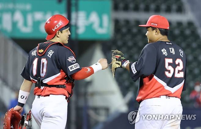 승리 후 하이파이브하는 박동원-황대인