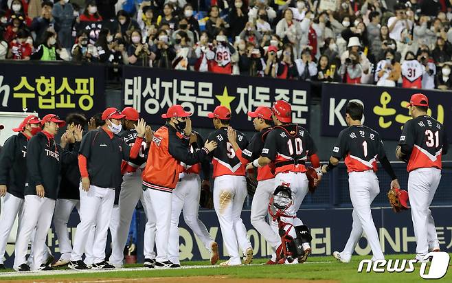(서울=뉴스1) 박세연 기자 = 4일 오후 서울 송파구 잠실야구장에서 열린 프로야구 '2022 신한은행 SOL KBO리그' KIA 타이거즈와 LG 트윈스의 경기에서 8대3으로 승리한 기아 김종국 감독과 선수들이 환호하고 있다. 2022.10.4/뉴스1