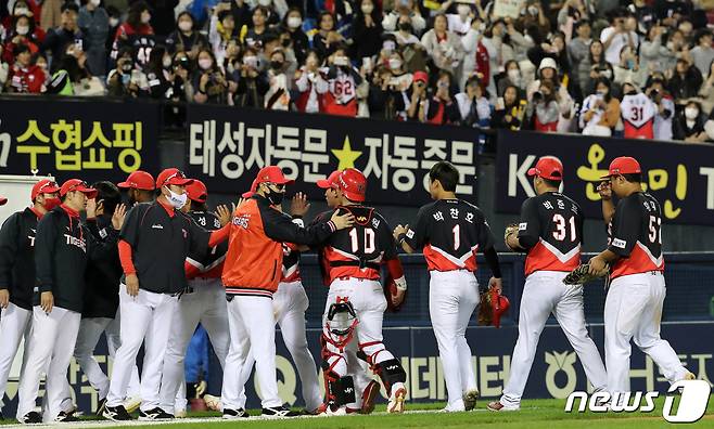 (서울=뉴스1) 박세연 기자 = 4일 오후 서울 송파구 잠실야구장에서 열린 프로야구 '2022 신한은행 SOL KBO리그' KIA 타이거즈와 LG 트윈스의 경기에서 8대3으로 승리한 기아 김종국 감독과 선수들이 환호하고 있다. 2022.10.4/뉴스1