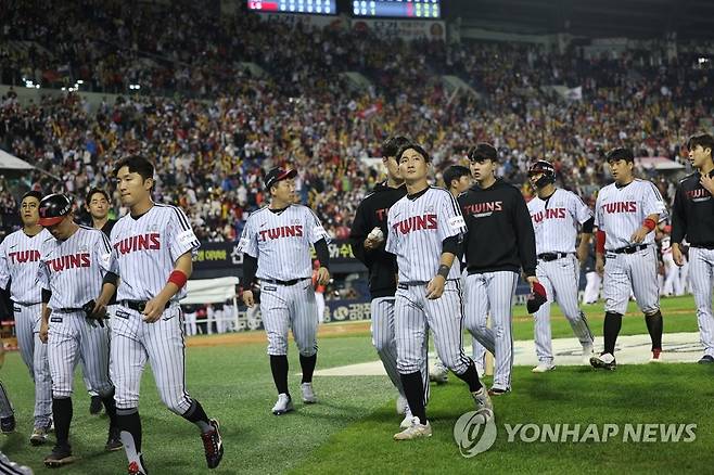 (서울=연합뉴스) 임화영 기자 = 4일 서울 송파구 잠실야구장에서 열린 프로야구 KIA 타이거즈와 LG 트윈스의 경기에서 3-8로 패배한 LG 선수들이 경기장을 빠져나가고 있다. 2022.10.4