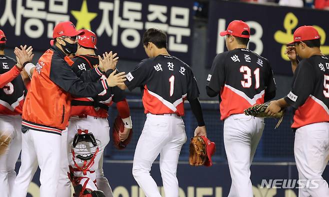 [서울=뉴시스] 권창회 기자 = 4일 오후 서울 송파구 잠실야구장에서 열린 2022 프로야구 KIA타이거즈와 LG 트윈스의 경기, 8대 3으로 승리한 KIA 선수들이 기뻐하고 있다. 2022.10.04. kch0523@newsis.com