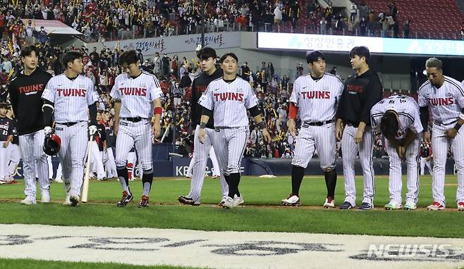 [서울=뉴시스] 권창회 기자 = 4일 오후 서울 송파구 잠실야구장에서 열린 2022 프로야구 KIA타이거즈와 LG 트윈스의 경기, 8대 3으로 패배한 LG선수들이 아쉬워하고 있다. 2022.10.04. kch0523@newsis.com