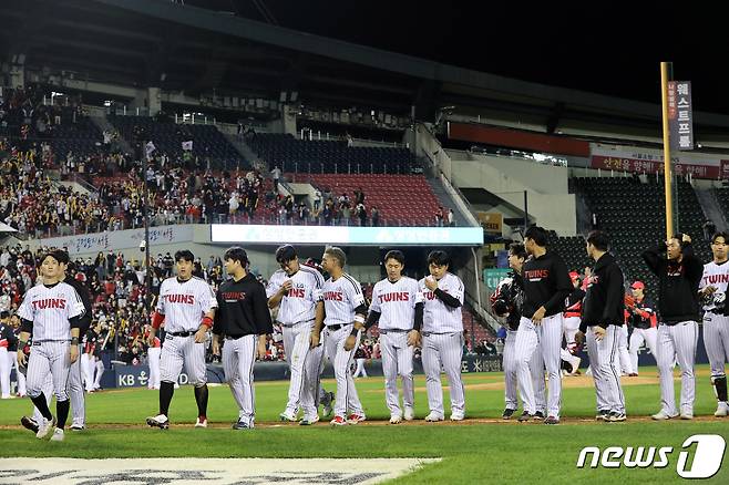 (서울=뉴스1) 박세연 기자 = 4일 오후 서울 송파구 잠실야구장에서 열린 프로야구 '2022 신한은행 SOL KBO리그' KIA 타이거즈와 LG 트윈스의 경기에서 3대8으로 패배한 LG 선수들이 아쉬운 표정을 짓고 있다. 2022.10.4/뉴스1