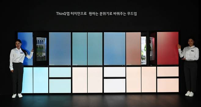 서울 강남구 삼성동 코엑스에서 4일 개막한 제53회 한국전자전(KES 2022)에서 LG전자 모델들이 도어 색상을 변경할 수 있는 ‘디오스 오브제컬렉션 무드업’ 냉장고를 소개하고 있다(위 사진). 삼성전자 모델들이 ‘가족 평화룸존’을 소개하고 있다. 5가지 주제의 체험존 중 하나로 수험생 자녀가 있는 집에서 겪을 수 있는 에피소드를 바탕으로 구성됐다.