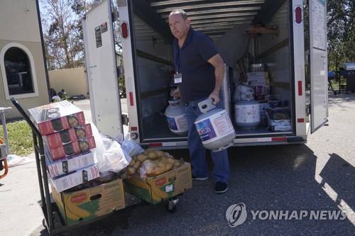 Mitchell Gottlieb arrives with supplies from Miami Beach for Chabad Lubavitch, Monday, Oct. 3, 2022, in Fort Myers, Fla. The synagogue has received supplies from all over Florida to help its members and neighbors. (AP Photo/Marta Lavandier)