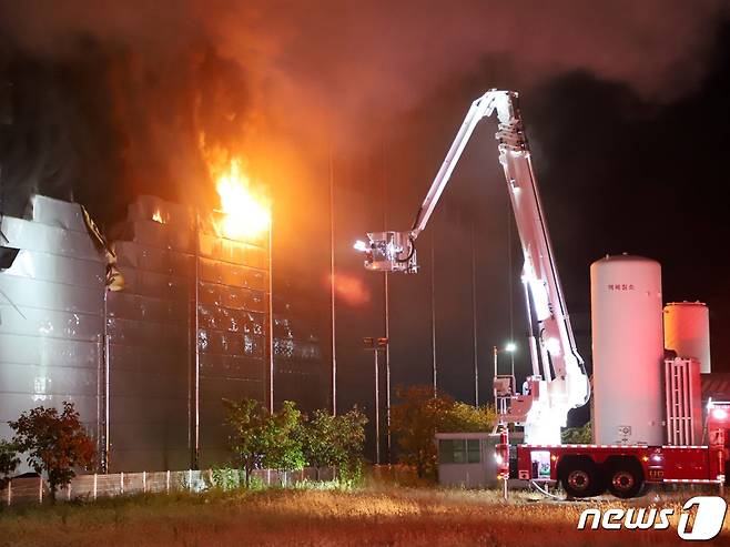 (구미=뉴스1) 최창호 기자 = 4일 오후 5시25분쯤 경북 구미시 4공단에 있는 공장건물에서 화재가 발생했다. 소방당국은 대응1단계에 이어 2단계로 격상하고 펌프차 등 장비 46대와 100명을 투입해 진화작업을 벌이고 있다.(경북소방본부제공)2022.10.4/뉴스1