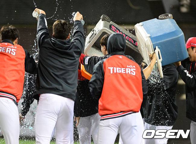 KIA 투수조 선수들이 데뷔 첫 10승을 거둔 이의리와 서재응 코치에게 물세례를 하고 있다. 2022.10.04 /jpnews@osen.co.kr