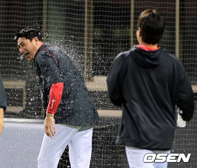 KIA 투수조 선수들이 데뷔 첫 10승을 거둔 이의리와 서재응 코치에게 물세례를 하고 있다. 2022.10.04 /jpnews@osen.co.kr