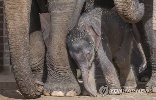 A baby elephant explores the outdoor enclosures of the elephant facility at Leipzig Zoo, Germany, Tuesday, Oct. 4, 2022. The cub, born on September 25, is cared for and protected by the other female elephants. (Jan Woitas/dpa via AP) GERMANY OUT; MANDATORY CREDIT