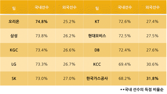 각 팀 국내 선수와 외국 선수가 팀 득점에서 차지하는 비율을 부록으로 첨부했다.
