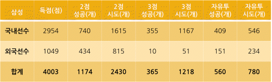 3점슛 부문을 살펴보기에 앞서, 한 가지 짚고 넘어갈 부분이 있다. 한 쿼터는 10분으로 진행하고, 농구는 아주 특별한 상황을 제외하면 5명이 코트에 나서기에, 교체 포함 1개 쿼터에 출전한 인원들이 소비한 시간은 도합 50분이다. 그렇게 4쿼터가 지나면, 한 팀 선수들의 출전 시간 합계는 총 200분이 된다. 규정상 외국 선수는 쿼터당 1인(교체 가능)만 출전할 수 있기에 한 경기에 두 외국 선수의 출전 시간 합계는 최대 40분, 전체 200분 중 20%에 해당하는 수치다. 국내 프로농구 사정상 외국 선수가 외곽에서 플레이하는 경우를 국내 선수와 직접 비교하는 것엔 큰 의의를 두기 어렵다. 3점슛 기록은 참고로 남긴다.