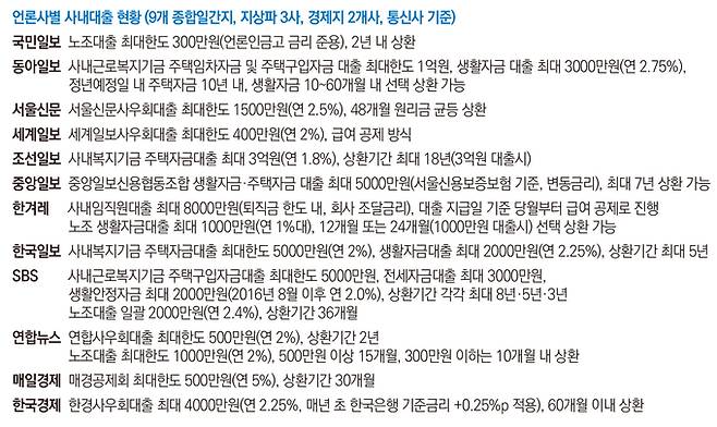 동아일보·한국일보·SBS도 사내복지기금을 통해 사내대출을 운영한다. 지난해 12월 동아일보는 기금을 추가 출연해 최대 대출 한도를 기존 8000만원에서 1억원으로 늘렸다. 주택임차자금·주택구입자금대출 한도는 최대 1억원이고, 생활자금 대출은 최대 3000만원이다. 지난 2017년 사내복지기금을 신설한 한국일보는 현재 20억원 규모로 기금을 운영하고 있다. 이 기금으로 주택자금대출(최대 5000만원), 생활자금대출(2000만원)을 각각 연 2%, 2.25%로 빌려주고 있다. SBS는 사내복지기금으로 주택구입자금(최대 5000만원), 전세자금(3000만원), 생활자금(2000만원)을 연 2.5% 이율로 대출해주고 있다.