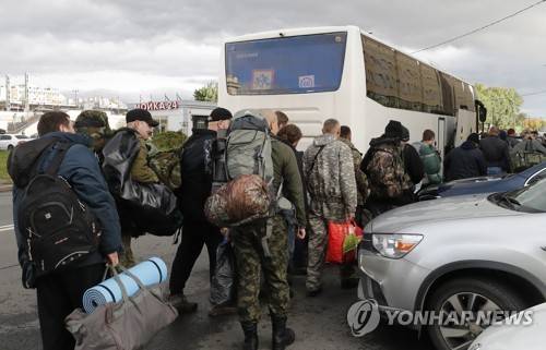 epa10222788 Russian conscripted men prepare to board a bus at a recruiting office during Russia's partial military mobilization, in St. Petersburg, Russia, 04 October 2022. Russian President Putin announced in a televised address to the nation on 21 September, that he signed a decree on partial mobilization in the Russian Federation due to the conflict in Ukraine. Russian Defense Minister Shoigu said that 300,000 people would be called up for service as part of the move. EPA/ANATOLY MALTSEV