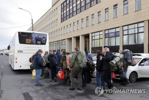 epa10222786 Russian conscripted men prepare to board a bus at a recruiting office during Russia's partial military mobilization, in St. Petersburg, Russia, 04 October 2022. Russian President Putin announced in a televised address to the nation on 21 September, that he signed a decree on partial mobilization in the Russian Federation due to the conflict in Ukraine. Russian Defense Minister Shoigu said that 300,000 people would be called up for service as part of the move. EPA/ANATOLY MALTSEV