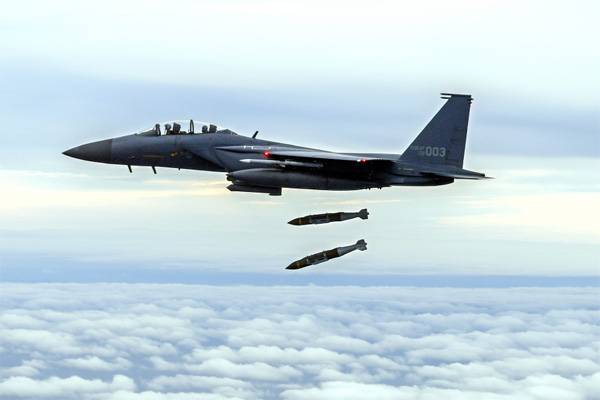 한미연합 전력이 4일 북한의 중거리 탄도미사일 도발에 대응해 연합 공격편대군 비행과 정밀폭격 훈련을 펼쳤다. 이날 훈련에는 한국 공군의 F-15K 전투기와 미 7공군 소속 F-16 전투기가 4대씩 참여해 대북 억제력을 과시했다. 사진은 한국 측 F-15K 전투기가 서해상 직도 사격장에 합동정밀직격탄(JDAM) 두 발을 투하하는 모습.