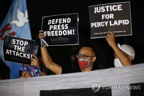 epa10222811 Protesters hold signs during an indignation rally against members of the media's killings in Quezon City, Metro Manila, Philippines, 04 October 2022. A rally was held by human rights advocates and members of journalist organizations to demand government action and condemn the killing of broadcast journalist Percival Mabasa, also known as Percy Lapid, who was shot dead by unidentified assailants on 03 October while on his way to work in Las Pinas City, according to latest police reports. EPA/ROLEX DELA PENA