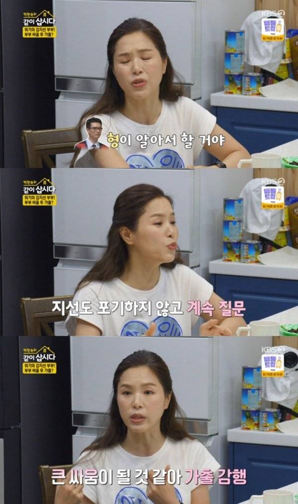 4일 오후 방송된 KBS2 '박원숙의 같이 삽시다'에서는 김지선이 남편과 부부 싸움을 한 이후 가출을 감행한 에피소드를 말하는 장면이 그려졌다.