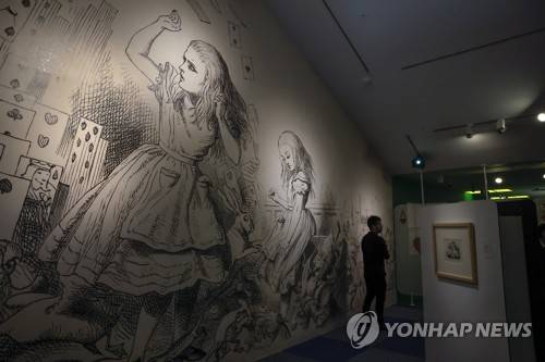 epa10222819 A visitor looks at works presented at the exhibition 'Alice in Wonderland by Dali, Ernst, Laurencin and Tenniel' in Madrid, Spain, 04 October 2022. The exhibition will be open to public from 05 October 2022 to 08 January 2023. EPA/Chema Moya