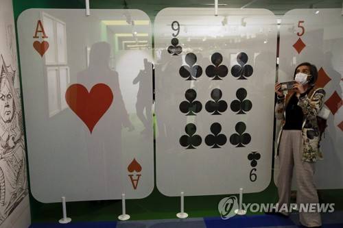epa10222820 A visitor looks at works presented at the exhibition 'Alice in Wonderland by Dali, Ernst, Laurencin and Tenniel' in Madrid, Spain, 04 October 2022. The exhibition will be open to public from 05 October 2022 to 08 January 2023. EPA/Chema Moya