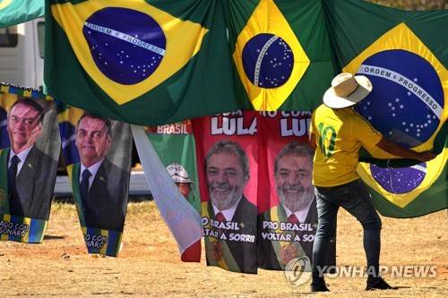 FILE - Presidential election campaign flags hang for sale, featuring the faces of both current President Jair Bolsonaro, left, and former President Luiz Inacio Lula da Silva, outside the Supreme Electoral Court in Brasilia, Brazil, Sept. 5, 2022. Bolsonaro will face da Silva in the Oct. 30 runoff for president. (AP Photo/Eraldo Peres, File)