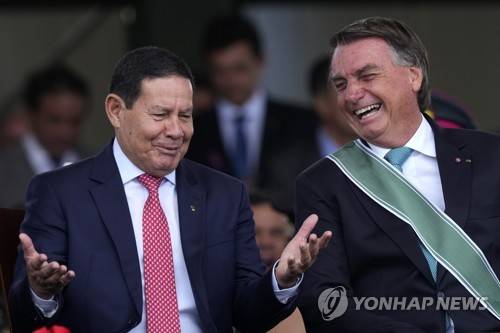 FILE - Brazil's President Jair Bolsonaro, right, laughs next to his Vice President Gen. Hamilton Mourao during a ceremony marking Army Day at Army headquarters in Brasilia, Brazil, April 19, 2022. Under Bolsonaro's orders, Mourao oversaw a fruitless deployment of thousands of soldiers with no experience in environmental law enforcement to the Amazon to prevent deforestation and man-made fires during the first three years of Bolsonaro’s rule. The initiative has been heavily criticized by environmentalists for its high costs without any real impact. (AP Photo/Eraldo Peres, File)