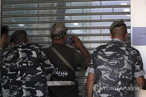 An intelligence army officer takes pictures with his mobile phone at the entrance of a Byblos Bank branch that was broken into by Ali Hodroj holding a handgun, firing a warning shot and demanding about $40,000 of his trapped savings, in Tyre, south Lebanon, Tuesday, Oct. 4, 2022. Hodroj retrieved about $9,000 in Lebanese pounds following negotiations before he turned himself in to police outside the branch. Lebanese depositors, including a retired police officer, stormed at least four banks in the cash-strapped country Tuesday after banks ended a weeklong closure and partially reopened. (AP Photo/Mohammed Zaatari)