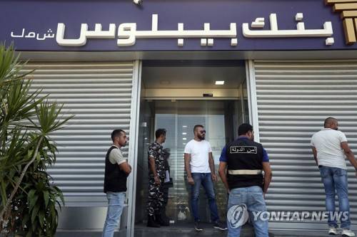 Lebanese security officers stand at the entrance of a Byblos Bank branch that was broken into by depositor Ali Hodroj holding a handgun, firing a warning shot and demanding about $40,000 of his trapped savings, in Tyre, south Lebanon, Tuesday, Oct. 4, 2022. Hodroj retrieved about $9,000 in Lebanese pounds following negotiations before he turned himself in to police outside the branch. Lebanese depositors, including a retired police officer, stormed at least four banks in the cash-strapped country Tuesday after banks ended a weeklong closure and partially reopened. (AP Photo/Mohammed Zaatari)