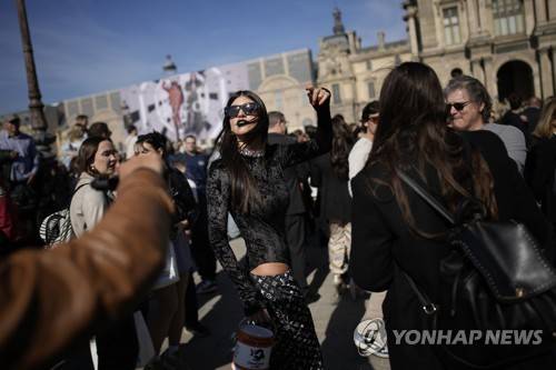 A woman reacts in the courtyard of the Louvre museum during Louis Vuitton ready-to-wear Spring/Summer 2023 fashion collection presented Tuesday, Oct. 4, 2022 in Paris. (AP Photo/Christophe Ena)